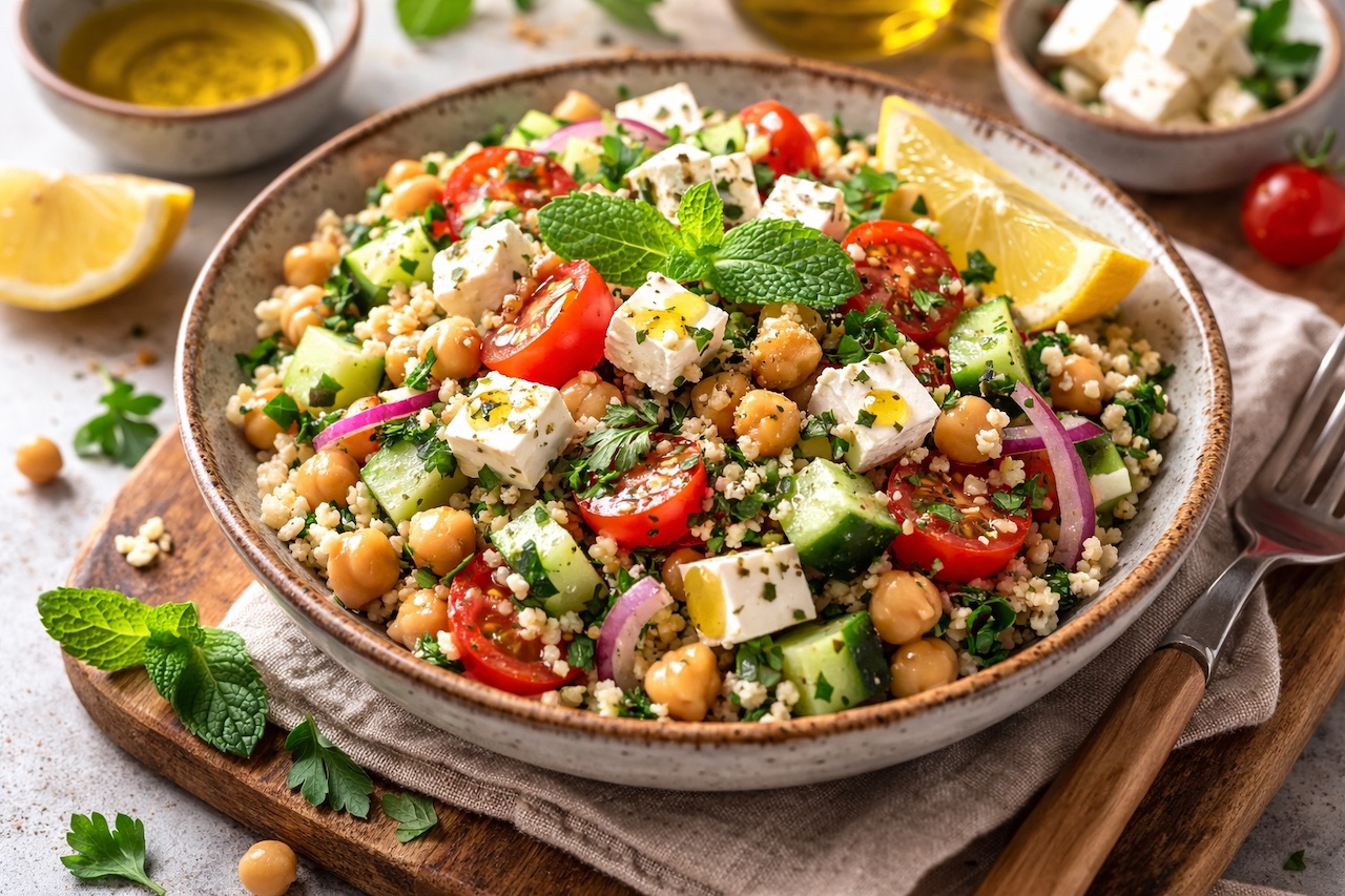 3) Taboulé pois chiches, concombre & feta